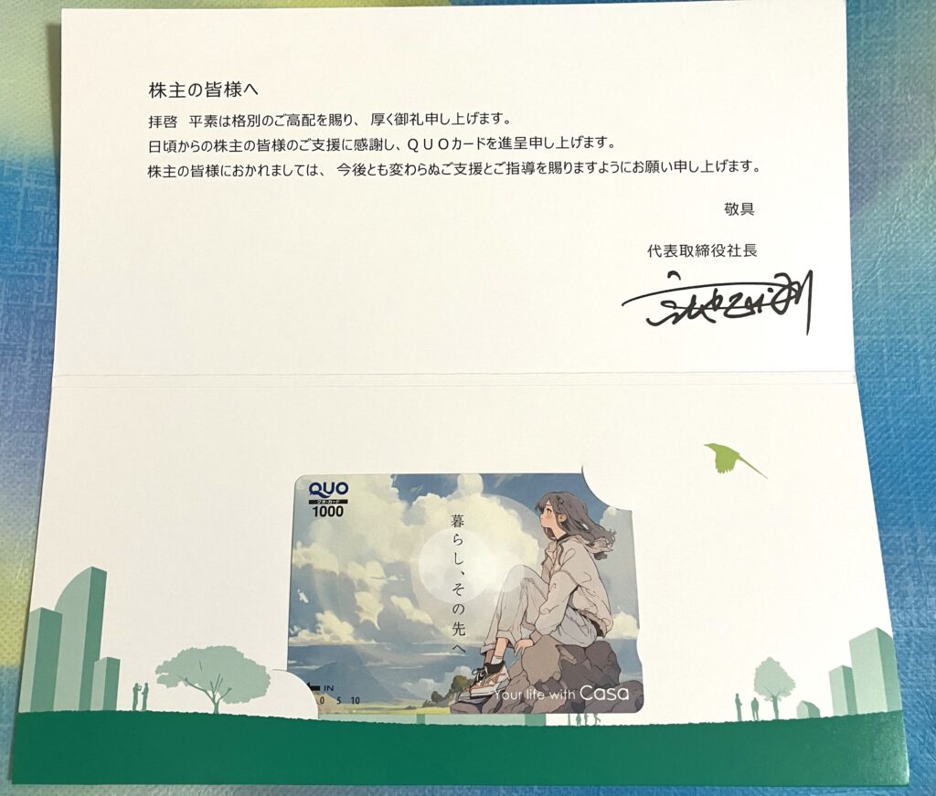 2024年9月17日、株式会社Casa(7196)から、株主優待としてクオカード1,000円分が届きました!